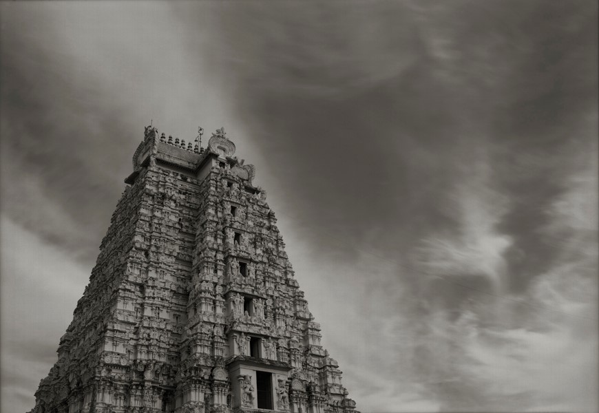 In the image “Kanchipuram #638,” the photographer has placed himself within a sacred space on a pathway with the deity directly ahead. In the shrine’s low interior light, viewers can observe carved stone columns receding into the distance along a pathway alight with devotional fires.