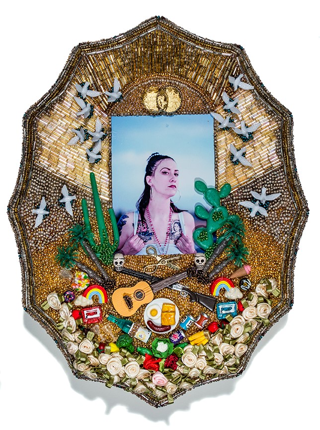 Libby Paloma creates wall hung multi-media pieces that memorialize her Chicanx and queer culture. In Chingona AKA Libby, she remembers her family roots while she claims her own individuality. The piece is embellished with seed beads and tiny objects that depict her world.