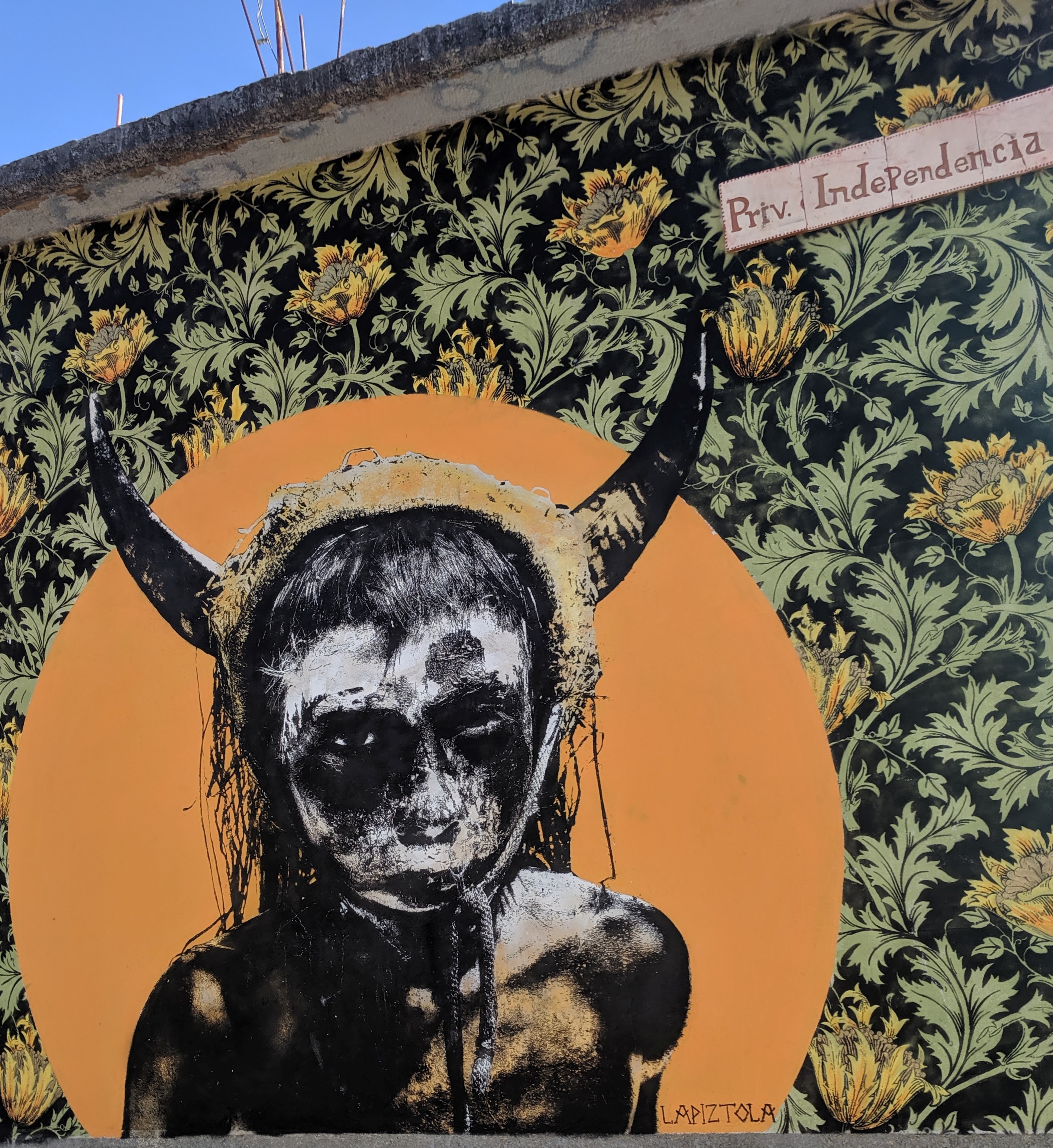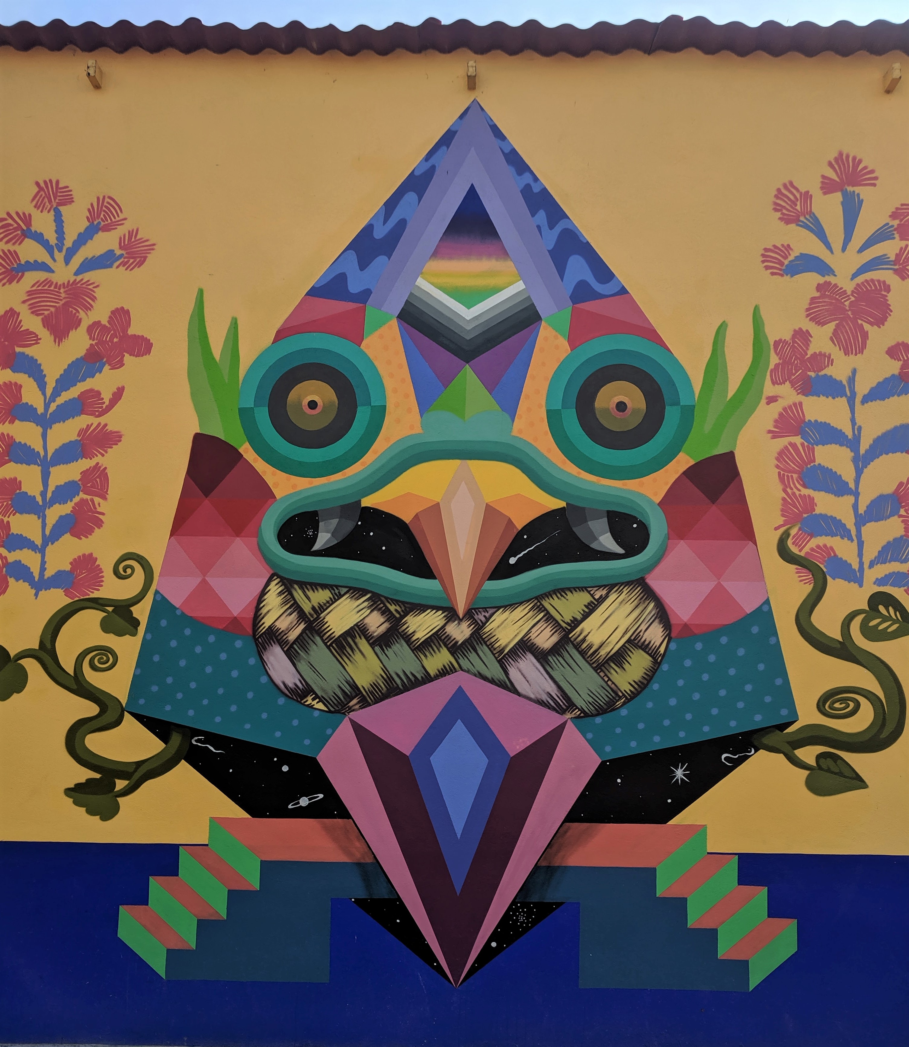 Asking around at the shops on the main street into town, a helpful merchant said he did know the artist and drew us a tiny map and pointed up the hill. We began walking up the hill and continued as the road went from cobblestones to hard-packed dirt. As we walked up hills we began seeing murals that had a similar theme.