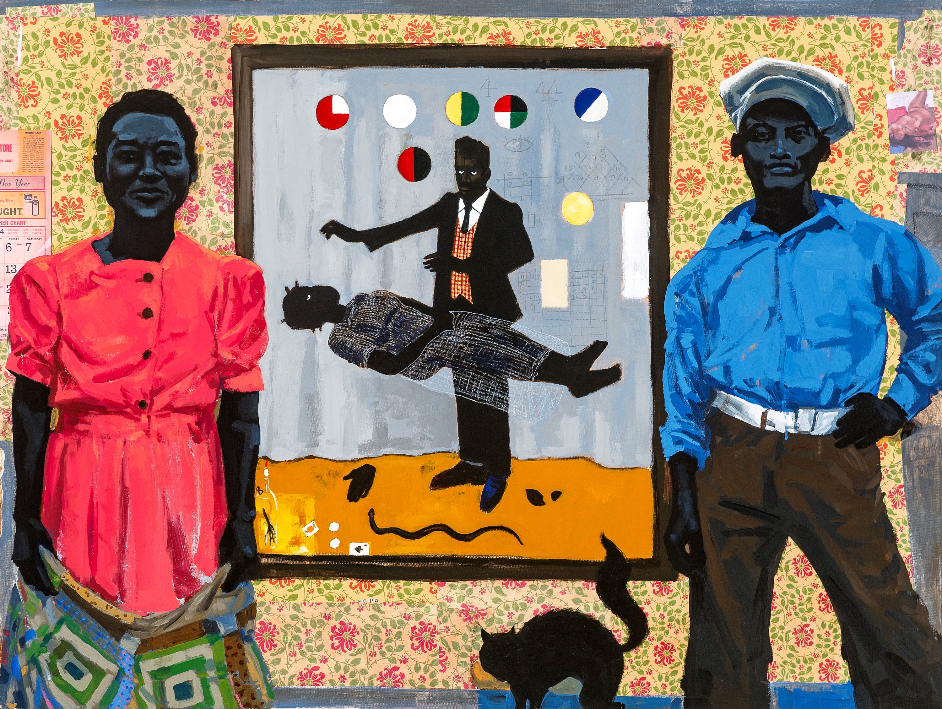 In the painting, “Who Should Own Black Art,” viewers will see two figures posing proudly besides a large replica of Kerry James Marshall’s painting, “When Frustration Threatens Desire.” The painting within the painting has been slightly altered, with the black cat jumping into the foreground with the living humans. Ransome has referenced the question that has become key to the dialogue of art – who should be able to own original artworks? And in this particular instance, who gets to own artwork created by Black artists who have achieved fame?
