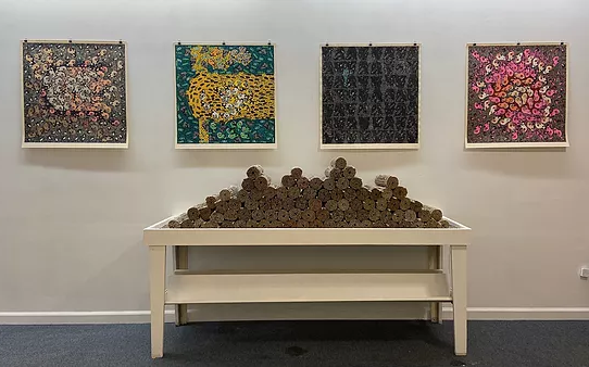 Zheng Xuewu presents his latest printmaking and includes the installation of “Century Text.” This artwork promotes cross-cultural learning and was created from newspapers collected throughout the world and tightly rolled into thin rods. Xuewu then ties the rods together creating rolled scrolls. A table centered below the prints holds these rolled scrolls, appearing as an altar that holds precious objects.