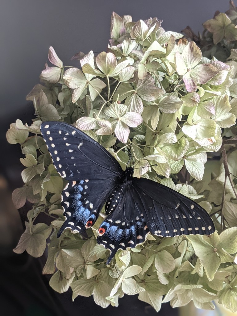 Butterfly visitor sits on dried hydrangea from the garden.