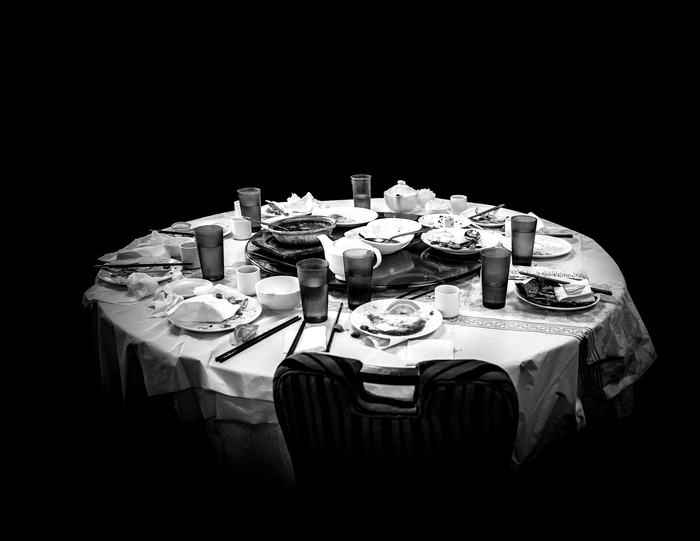 Ray Koh’s “No Omakase” shows a restaurant table where the diners have recently left: the dirty dishes on the table at what must have been a sumptuous meal and the darkness surrounding the table all emphasize a feeling of abandonment. It also brings to mind communal meals with friends and family that seem like old memories.