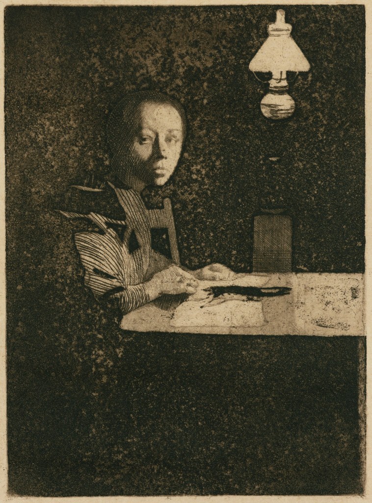 Included are portraits such as the etching, “Self Portrait at the Table” by Käthe Kollwitz, depicting herself momentarily looking up from her work to gaze directly at the viewer. In “Woman Resting Her Head on Her Hands,” Titina Maselli’s pen and ink drawing takes up the entire picture plane, making a powerful portrait with patterning and strong textural blocks. Alice Neel’s “Mother and Child” is a self-portrait holding her daughter; a bittersweet painting remembering Neel’s one-year-old child that died. Neel paints the park they are visiting with a bleak background in the dead of winter; two bare trees frame the figures seated on a park bench. Neel posed the mother holding the child in a way that is reminiscent of historical depictions of the virgin and child.