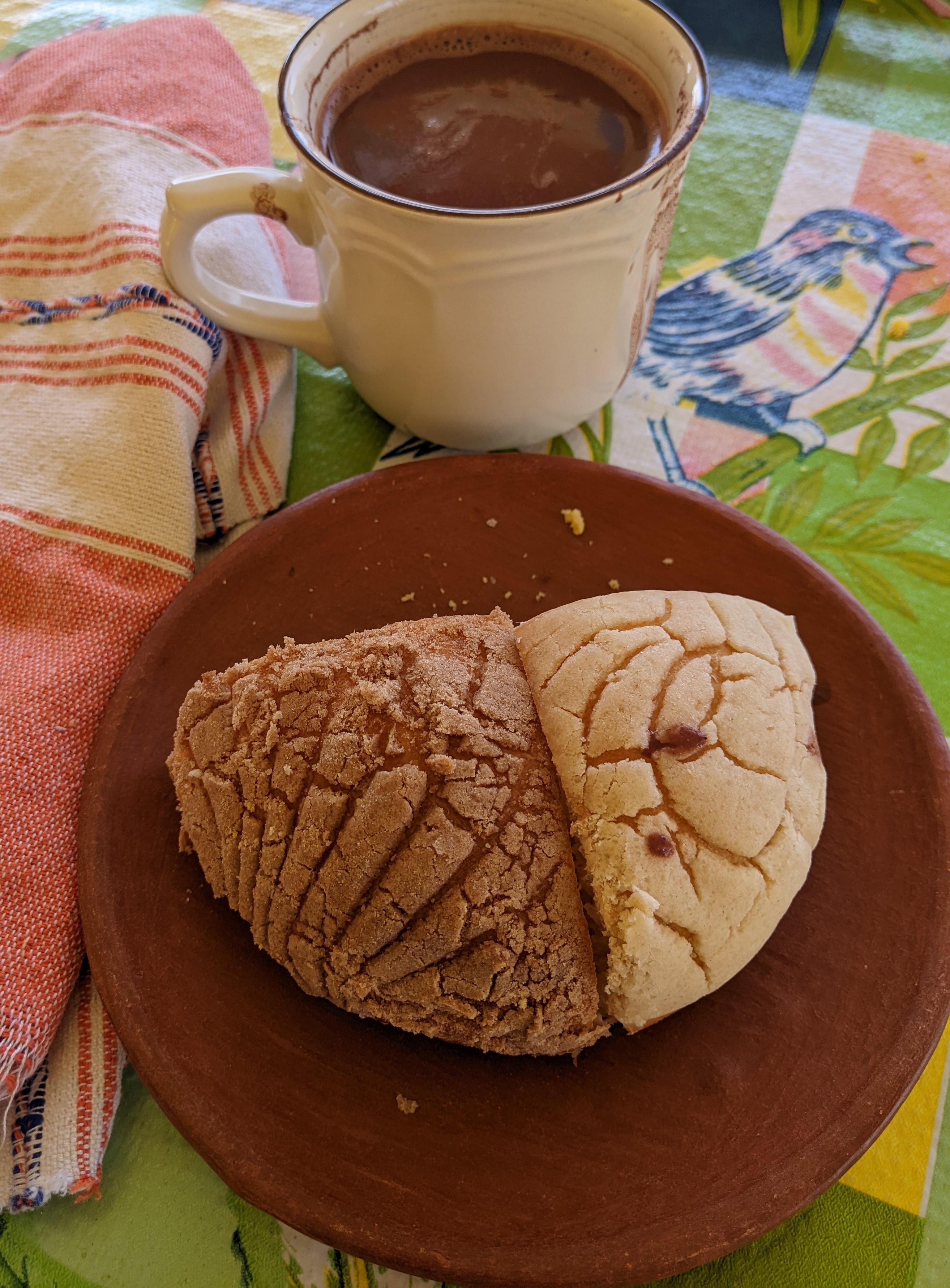 What do we do with the chocolate? It’s a great bittersweet chocolate to snack on. It can also be the base for sumptuous chocolate desserts. This morning we made hot chocolate and dipped fresh conchas into the steaming rich drink.